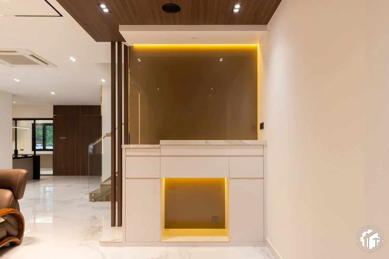 The foyer sets the tone with a custom-built entrance cabinet featuring recessed cove lighting that casts a warm glow across the reception area. A handcrafted timber room divider elegantly separates the foyer from the main living space while maintaining an open, connected feel.