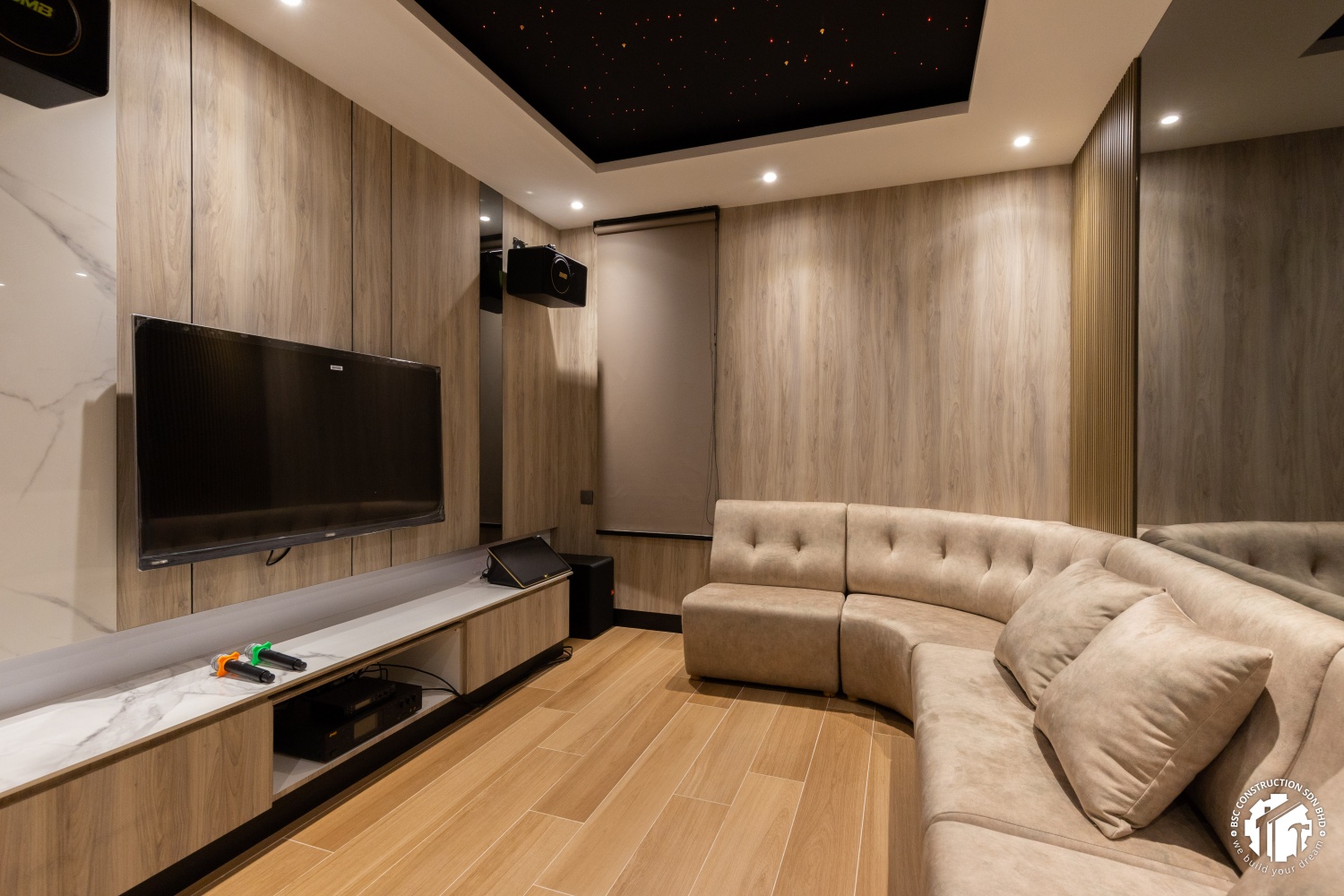 One of the standout features of this project: a purpose-built home theatre room located in the newly extended rear section. BSC Construction fitted the room with full acoustic wall treatment, darkened surfaces, and a stunning fibre-optic star-effect ceiling that transforms the space into a private cinema.