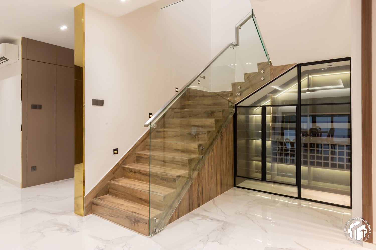 The centrepiece of the ground floor is a modern glass-panelled staircase with timber treads and a sleek steel stringer. Beneath the stairs, BSC Construction designed a custom wine display cabinet with temperature-controlled storage and LED accent lighting — transforming dead space into a lifestyle feature.
